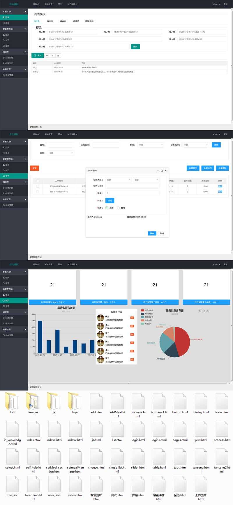 一套丰富的layui后台模板框架,具备了大多数后台的基本功能,客服PC端、客服管理端、知识库、自助问题、内部知识、套餐管理等OA办公系统后台管理模板html整套下载。