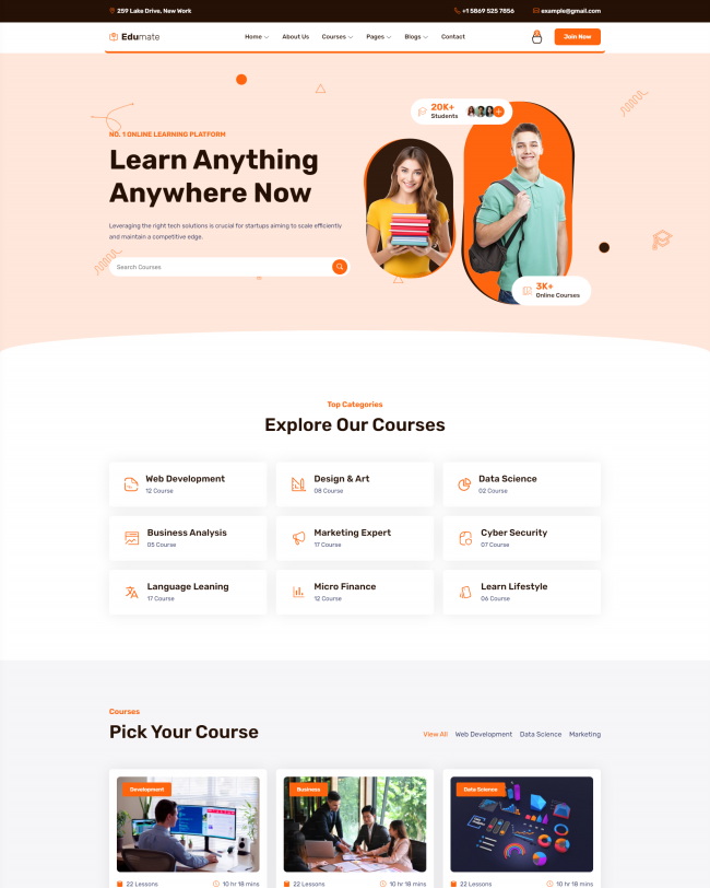 在线教育学习培训机构响应式网页模板,这是一款专为在线教育学习培训机构设计的网站模板,采用明亮的橙色风格,营造积极、活力的学习氛围。模板功能全面,涵盖机构介绍、课程展示、价格计划、博客分享等,旨在帮助教育机构提升品牌形象,吸引学员,促进课程销售。模板页面有以下特点:
