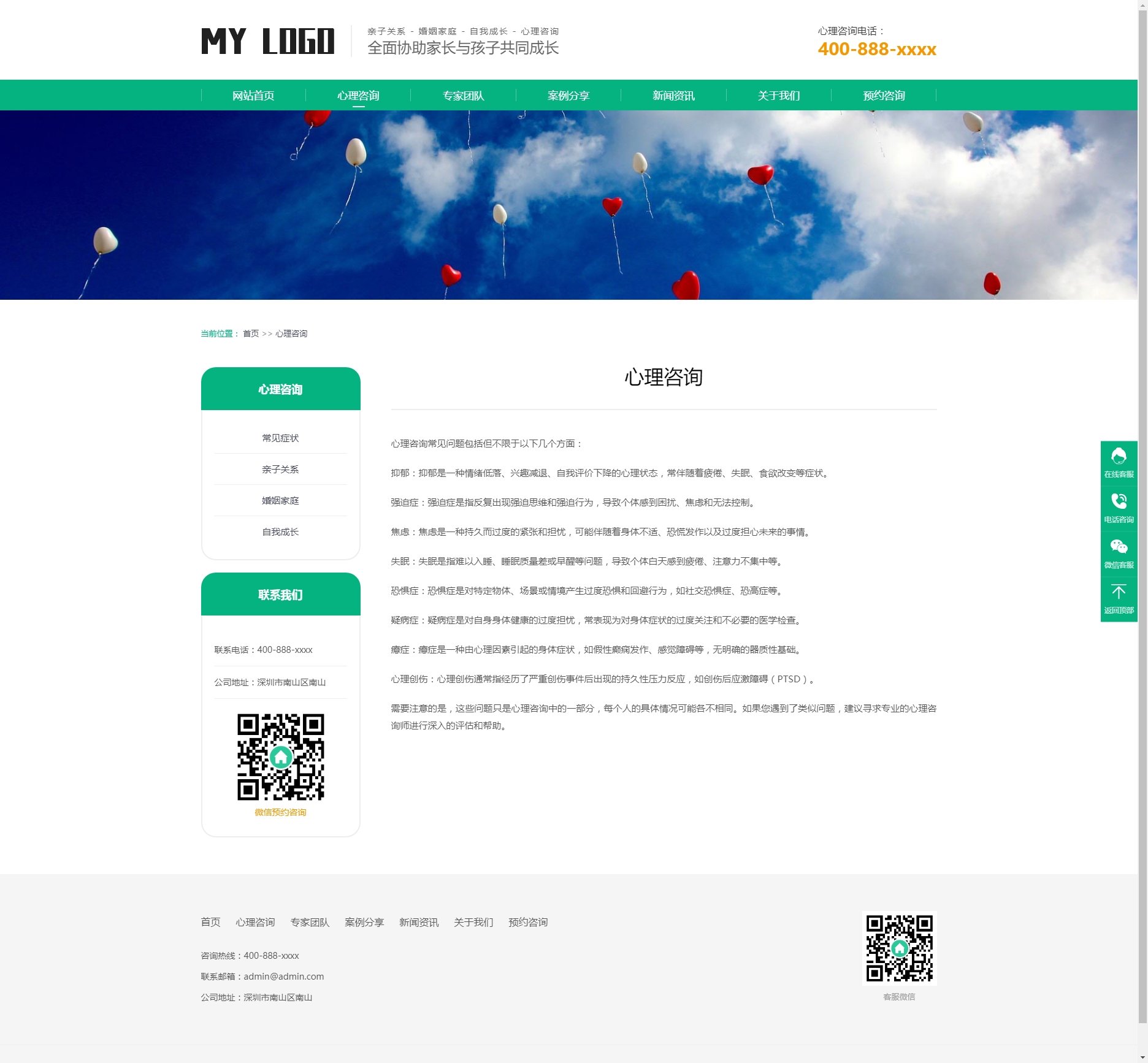 心理咨询家庭婚姻咨询服务机构网站,绿色风格,网站设计宽屏大气,可以作为心理咨询家庭婚姻咨询服务、儿童心理咨询专业机构网站使用。源码自带测试数据,安装非常方便,很适合各位需要建此类型网站的朋友使用。数据库采用sqlite链接方式,将源码上传到网站空间,然后确定自己用的web容器是iis,apache还是nginx导入相应的伪静态规则即可,非常的方便。