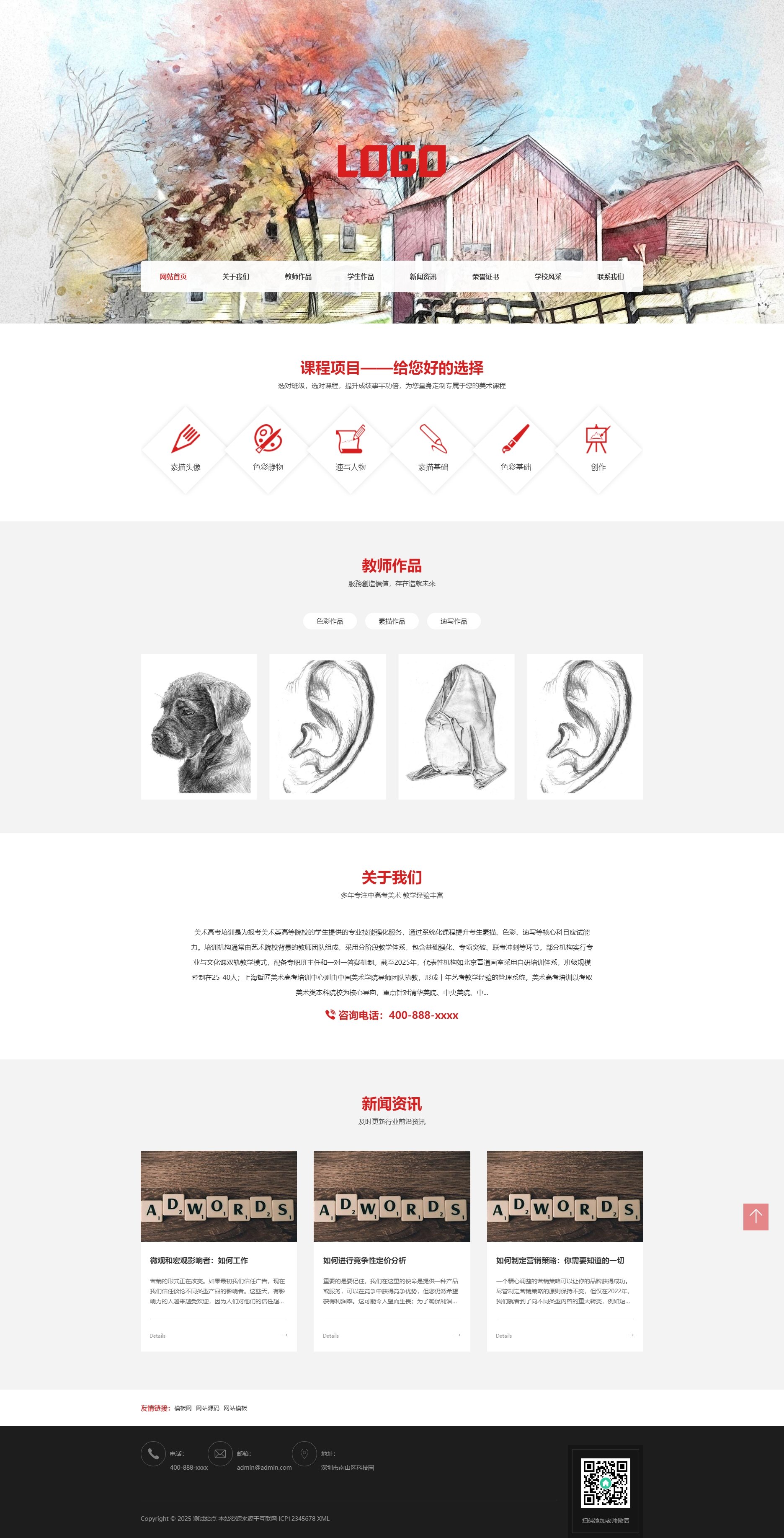 画室画廊美术培训机构响应式网站模板,红色主色调,这是一款画室画廊美术培训机构、绘画培训、素描艺术绘画专业培训学校的整站网站模板,基于PbootCMS,采用响应式自适应设计,后台可一键同步数据,管理人员只需要将源代码上传到空间或者服务器上即可使用。该模板通用性设计使其可以轻松适应其他行业,只需更换相应的文字和图片即可。安装包内提供完整的安装教程和测试数据,用户可以方便地进行本地测试和部署,修改和部署上线都很方便。