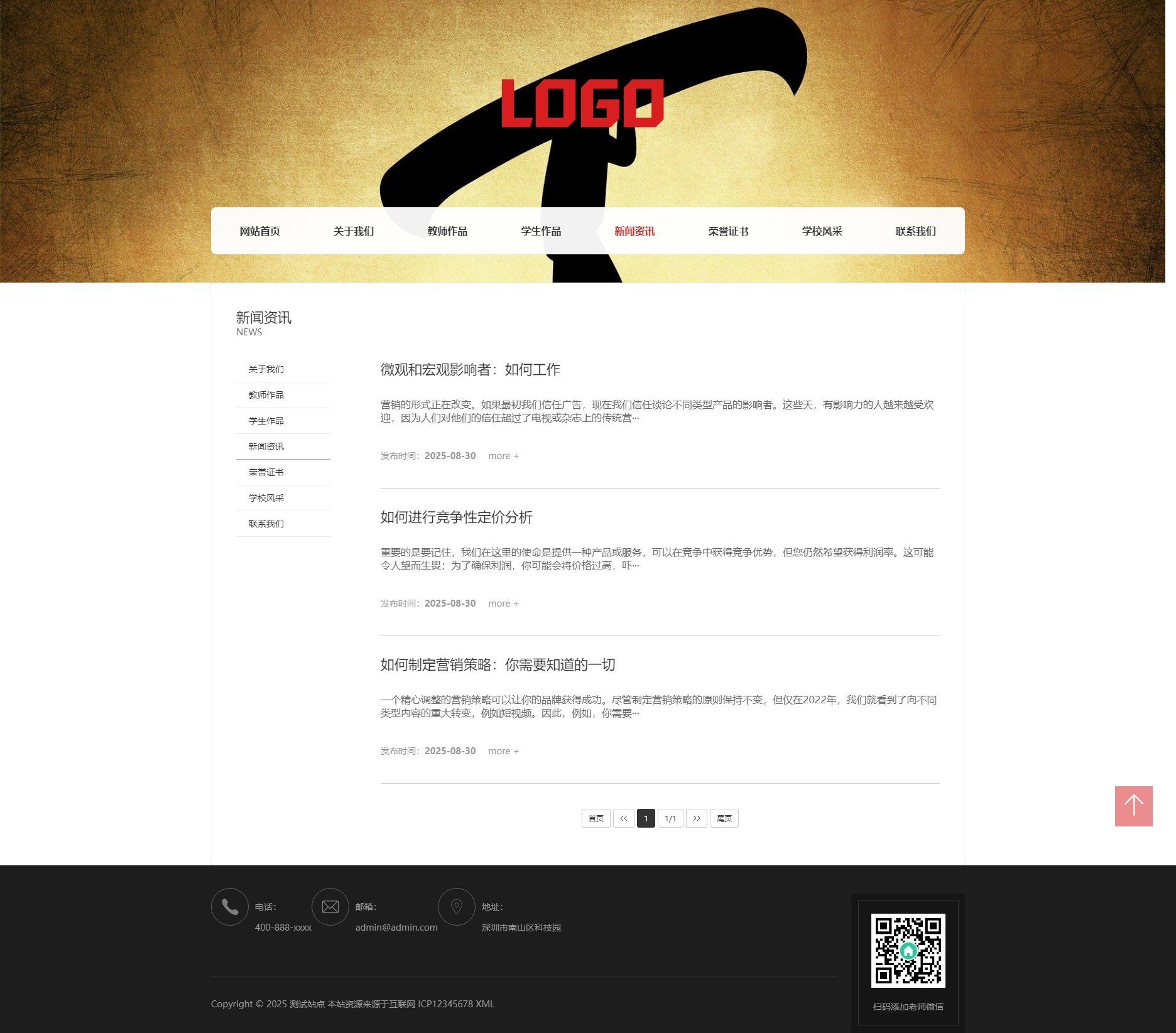 - 栏目设定:网站预设教师作品、学生作品、新闻资讯、荣誉证书等栏目和功能,可展示培训学校需要的内容。