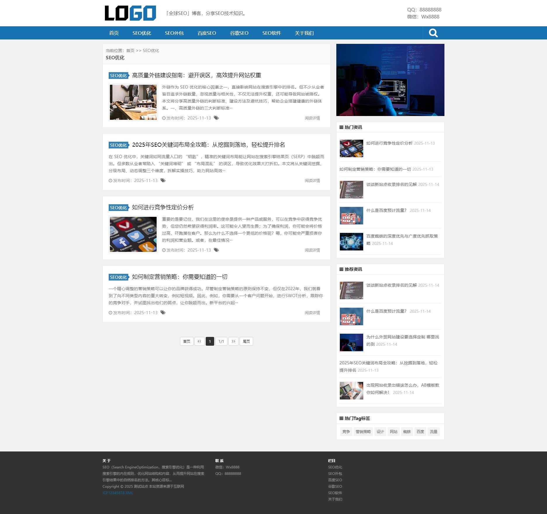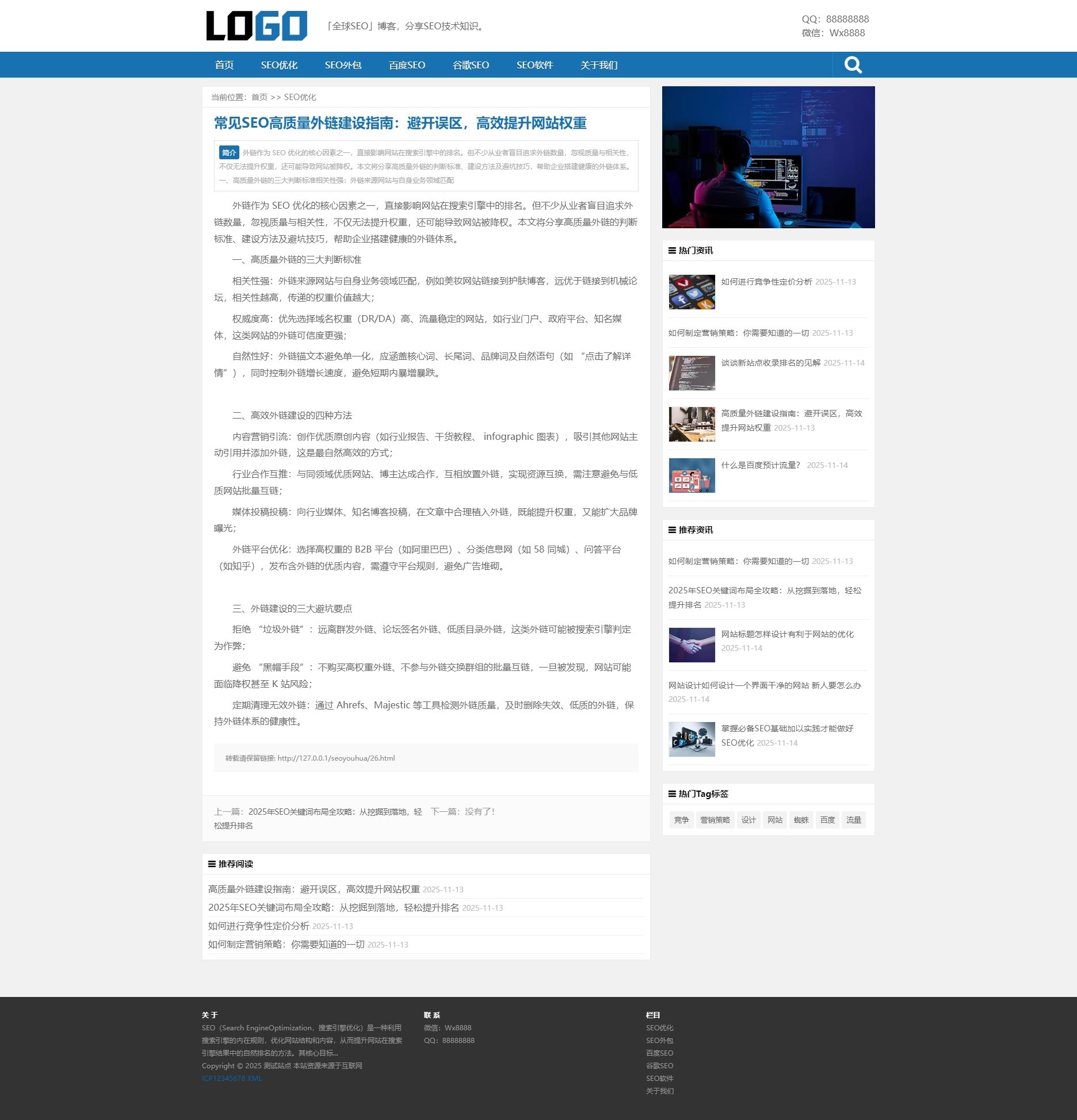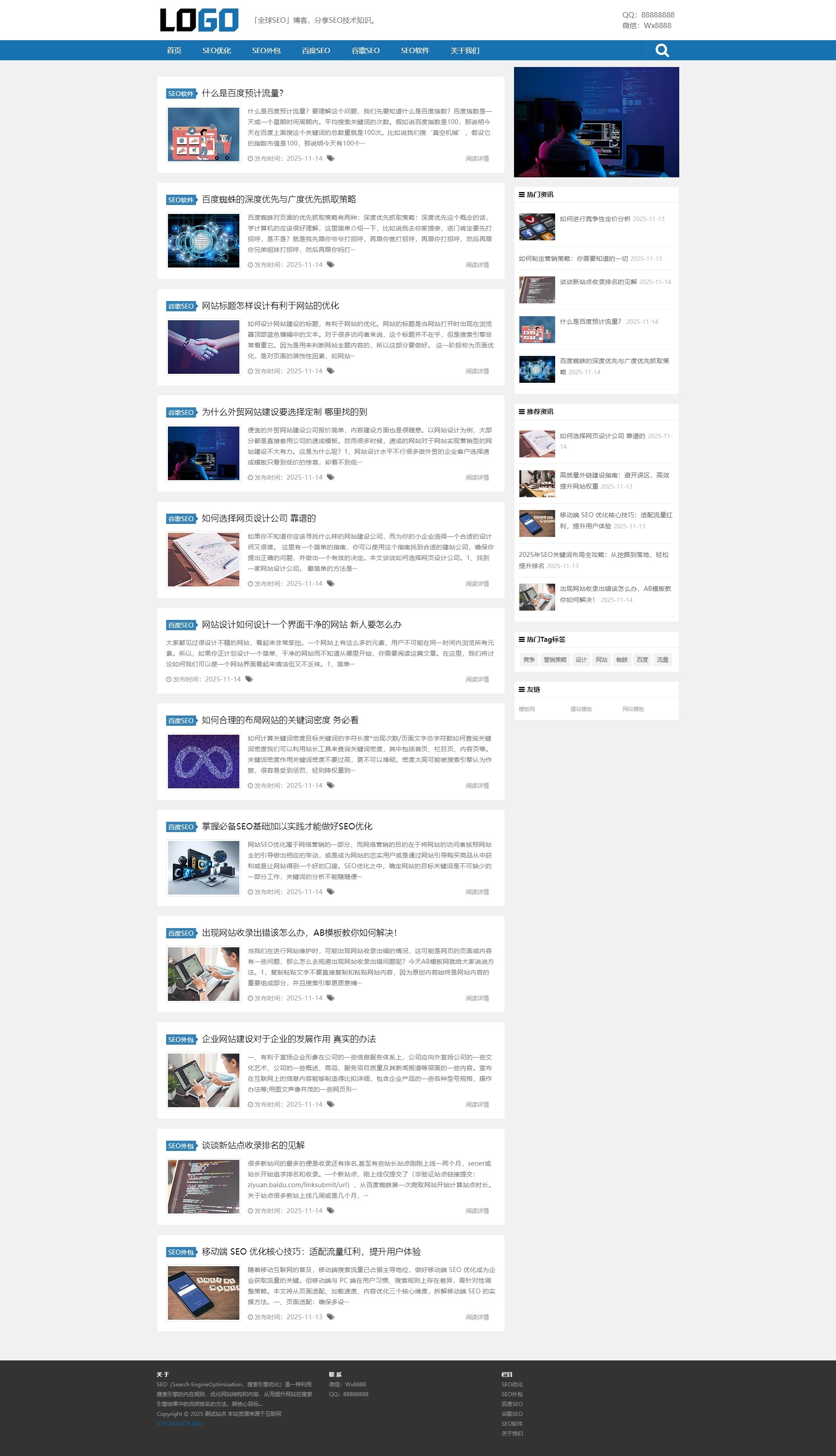 SEO优化个人博客资讯响应式网站模板,实用蓝色主色调,这是一款新闻资讯、SEO优化资源教程、个人博客主题、文章资讯展示类通用的整站网站模板。网站源码基于PbootCMS,采用响应式自适应设计,后台可一键同步数据,管理人员只需要将源代码上传到空间或者服务器上即可使用。该模板通用性设计使其可以轻松适应其他行业,只需更换相应的文字和图片即可。安装包内提供完整的安装教程和测试数据,用户可以方便地进行本地测试和部署,修改和部署上线都很方便。