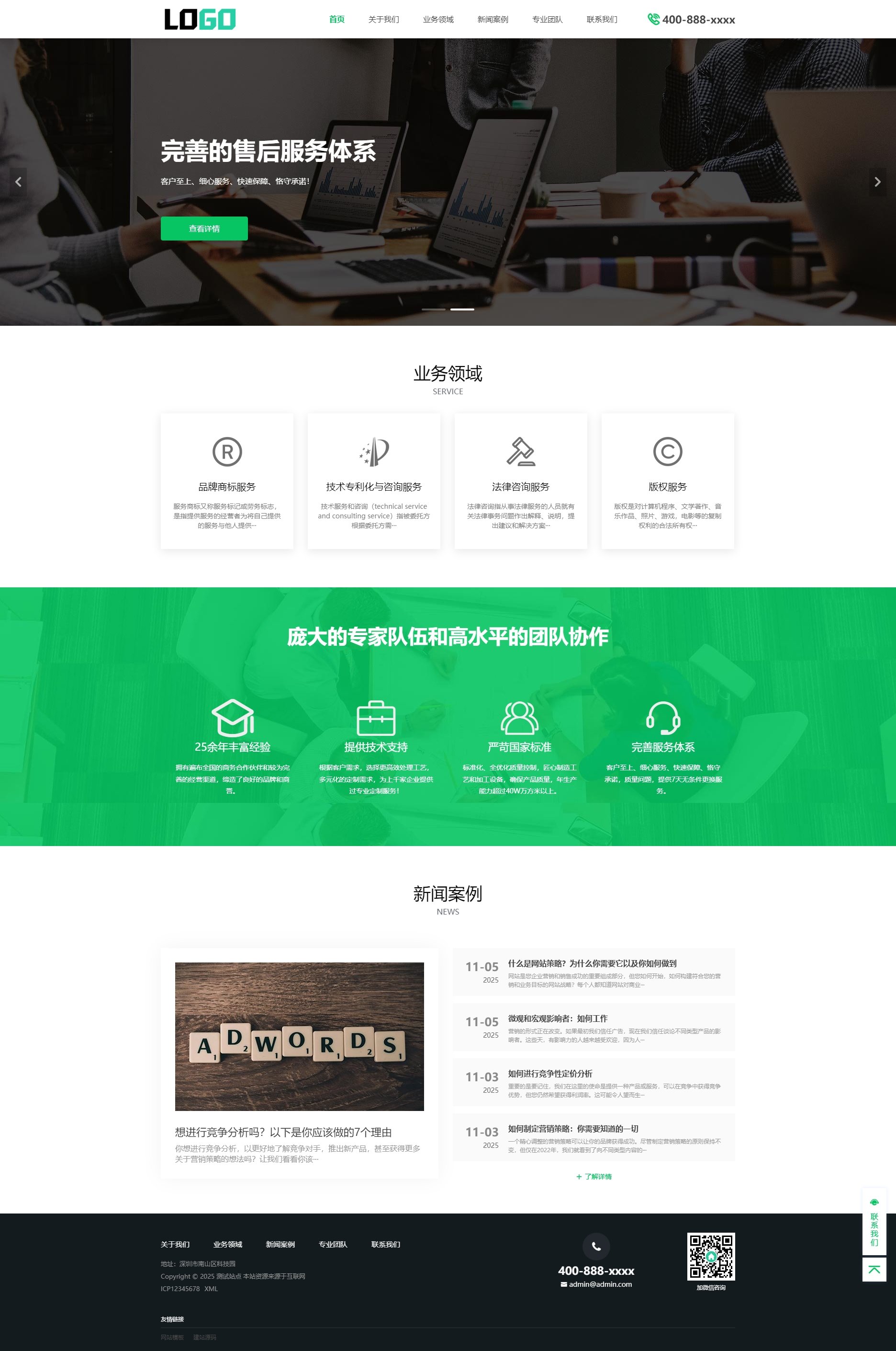 商标注册专利申请查询服务公司网站模板,绿色主色调,采用PC+WAP适配设计,这是一款商标注册专利申请查询服务公司、公司商务服务通用的整站网站模板,基于PbootCMS,采用PC+WAP适配设计,后台可一键同步数据,管理人员只需要将源代码上传到空间或者服务器上即可使用。该模板通用性设计使其可以轻松适应其他行业,只需更换相应的文字和图片即可。安装包内提供完整的安装教程和测试数据,用户可以方便地进行本地测试和部署,修改和部署上线都很方便。
