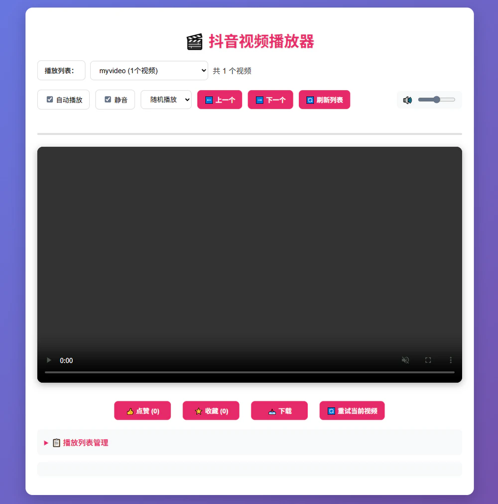 播放历史前端缓存使用流程1. 选择播放列表 → 选择.txt文件2. 开始播放 → 点击"下一个"按钮3. 互动操作 → 点赞/收藏当前视频4. 管理列表 → 查看点赞收藏,直接播放指定视频5. 下载视频 → 点击下载按钮保存当前视频故障排除· 视频无法播放:检查网络和播放列表格式· 操作不保存:确认videos目录有写权限· 自动播放失败:点击页面激活播放权限移动端特性· 自动检测移动设备· 默认开启声音· 触摸友好的界面设计· 响应式布局这个可以搭配着我之前发的解析工具一起使用,下载的txt放到根目录自动识别里面的链接